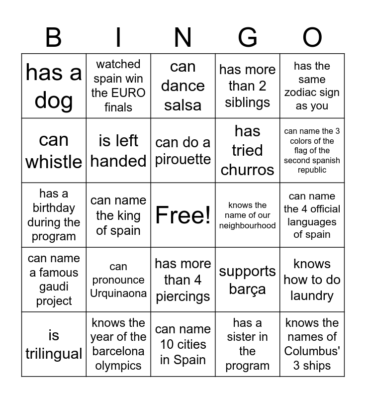 This bingo card has a free space and 25 words: can pronounce Urquinaona, can name 10 cities in Spain, can do a pirouette, is trilingual, has the same zodiac sign as you, has a dog, can whistle, watched spain win the EURO finals, knows the name of our neighbourhood, has more than 4 piercings, has tried churros, has a birthday during the program, supports barça, knows how to do laundry, is left handed, has been to a Spanish speaking country (not spain), can name the 4 official languages of spain, can dance salsa, can name the 3 colors of the flag of the second spanish republic, can name the king of spain, knows the names of Columbus' 3 ships, knows the year of the barcelona olympics, can name a famous gaudi project, has more than 2 siblings and has a sister in the program.