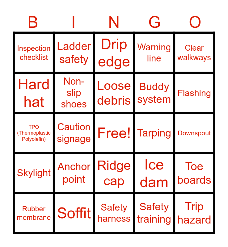 This bingo card has a free space and 50 words: Slip hazard, Trip hazard, Fall protection, Safety harness, Anchor point, Guardrails, Ladder safety, 3-point contact, Hard hat, Safety glasses, Non-slip shoes, Warning line, Toe boards, Ice dam, Wet surface, Uneven surface, Loose debris, Tarping, Weather awareness, Clear walkways, Caution signage, Safety training, Inspection checklist, Buddy system, First aid kit, Shingles, Flashing, Underlayment, Drip edge, Ridge cap, Vent boot, Ice and water shield, Roof deck, Fascia, Soffit, Eaves, Valleys, Dormer, Gutter, Downspout, Roofing nail, Roofing felt, Asphalt, Torch-down, Rubber membrane, TPO (Thermoplastic Polyolefin), EPDM (Ethylene Propylene Diene Monomer), Roof pitch, Skylight and Roof harness.