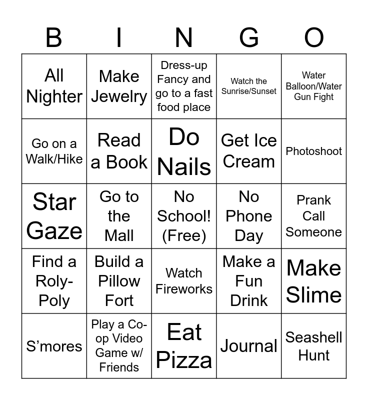 This bingo card has a free space and 47 words: Build a Sandcastle, Seashell Hunt, Pool Party, Eat Pizza, Build a Pillow Fort, Watch a New Movie/Show, Make Jewelry, Learn a New Skill, Go on a Walk/Hike, Make an I-Movie, Read a Book, Watch the Sunrise/Sunset, Make Slime, Make a Fun Drink, Karaoke, Try a New Coffee Shop/Restaurant, Do Nails, No Phone Day, Tell Someone About Jesus, Water Balloon/Water Gun Fight, Go to the Mall, Journal, All Nighter, Get Ice Cream, Tie-Dye/Bleach/Paint Something, Photoshoot, S’mores, Late Night Drive/Talk, Watch Fireworks, Find a Roly-Poly, Clean/Organize the one thing you keep meaning to but always put off, Here-Me-Out Cake or Power Point, TRAMPOLINE, Fair/Carnaval, Play a Board Game, Play a Co-op Video Game w/ Friends, Prank Call Someone, Make a Dessert, Make a Nice Dinner, Climb a Tree, Picnic, Dress-up Fancy and go to a fast food place, Star Gaze, Play a Sport, Go on a Boat (Sail or Not), Thrifting and Make a Playlist for Summer.