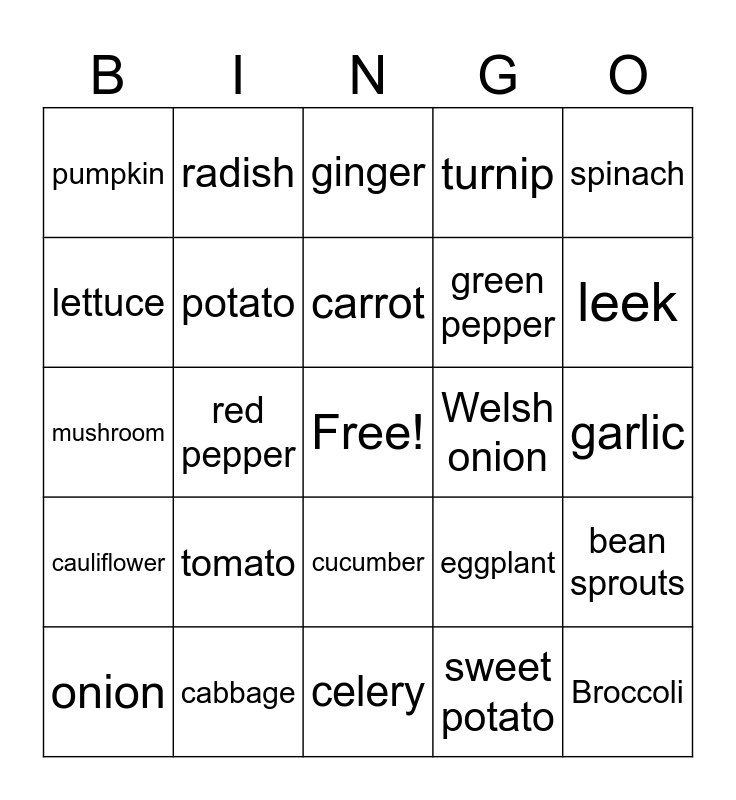 This bingo card has a free space and 24 words: tomato, cabbage, carrot, onion, spinach, pumpkin, lettuce, radish, Welsh onion, cucumber, green pepper, mushroom, eggplant, bean sprouts, potato, sweet potato, garlic, ginger, leek, red pepper, Broccoli, cauliflower, turnip and celery.