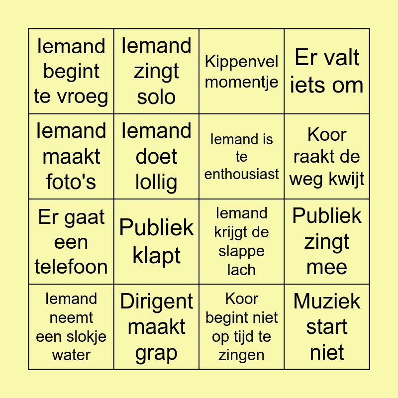 This bingo card has 16 words: Dirigent maakt grap, Publiek zingt mee, Kippenvel momentje, Iemand begint te vroeg, Er gaat een telefoon, Iemand zingt solo, Iemand krijgt de slappe lach, Koor begint niet op tijd te zingen, Iemand maakt foto's, Iemand doet lollig, Iemand neemt een slokje water, Er valt iets om, Publiek klapt, Koor raakt de weg kwijt, Iemand is te enthousiast and Muziek start niet.