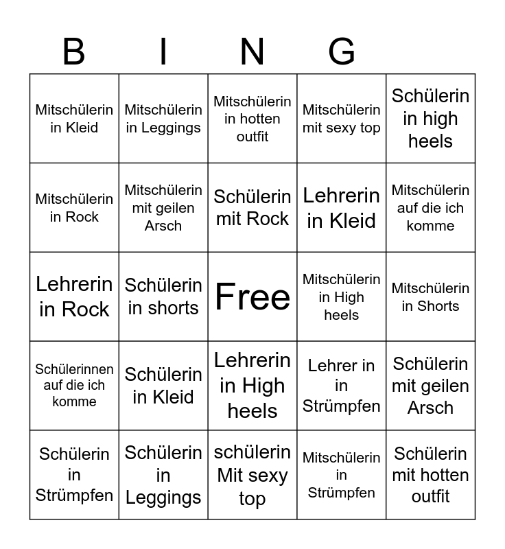 This bingo card has a free space and 24 words: Schülerin in Kleid, Schülerin in Leggings, Schülerin mit Rock, Schülerin in Strümpfen, Schülerin in high heels, Mitschülerin in Kleid, Mitschülerin in Rock, Mitschülerin in Leggings, Mitschülerin in High heels, Lehrerin in High heels, Lehrerin in Kleid, Lehrerin in Rock, Lehrer in in Strümpfen, Schülerin mit geilen Arsch, Mitschülerin mit geilen Arsch, Mitschülerin in Strümpfen, Mitschülerin in Shorts, Mitschülerin in hotten outfit, Mitschülerin auf die ich komme, Schülerin in shorts, Schülerin mit hotten outfit, Schülerinnen auf die ich komme, Mitschülerin mit sexy top and schülerin Mit sexy top.