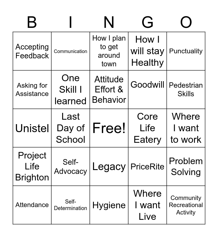 This bingo card has a free space and 24 words: Self-Advocacy, Self-Determination, Attitude Effort & Behavior, Attendance, Punctuality, Accepting Feedback, Asking for Assistance, Communication, Core Life Eatery, Legacy, Goodwill, Unistel, PriceRite, Problem Solving, One Skill I learned, Where I want Live, Where I want to work, How I plan to get around town, Pedestrian Skills, Last Day of School, Community Recreational Activity, Project Life Brighton, How I will stay Healthy and Hygiene.