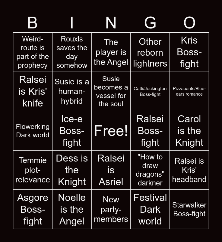 This bingo card has a free space and 24 words: Asgore Boss-fight, Dess is the Knight, Susie becomes a vessel for the soul, Festival Dark world, Kris Boss-fight, Weird-route is part of the prophecy, Rouxls saves the day somehow, The player is the Angel, Ralsei Boss-fight, Carol is the Knight, Flowerking Dark world, Susie is a human-hybrid, "How to draw dragons" darkner, Ralsei is Kris' headband, Ralsei is Kris' knife, Noelle is the Angel, New party-members, Other reborn lightners, Pizzapants/Blue-ears romance, Temmie plot-relevance, Ice-e Boss-fight, Ralsei is Asriel, Catti/Jockington Boss-fight and Starwalker Boss-fight.