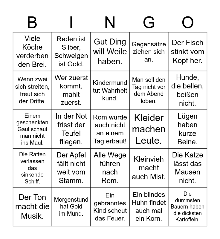 This bingo card has a free space and 24 words: Der Apfel fällt nicht weit vom Stamm., Morgenstund hat Gold im Mund., Kindermund tut Wahrheit kund., Der Ton macht die Musik., Der Fisch stinkt vom Kopf her., Viele Köche verderben den Brei., Wenn zwei sich streiten, freut sich der Dritte., Reden ist Silber, Schweigen ist Gold., Kleider machen Leute., Alle Wege führen nach Rom., Man soll den Tag nicht vor dem Abend loben., Einem geschenkten Gaul schaut man nicht ins Maul., Kleinvieh macht auch Mist., Die Katze lässt das Mausen nicht., Wer zuerst kommt, mahlt zuerst., Ein blindes Huhn findet auch mal ein Korn., Lügen haben kurze Beine., Gut Ding will Weile haben., Hunde, die bellen, beißen nicht., In der Not frisst der Teufel fliegen., Die dümmsten Bauern haben die dicksten Kartoffeln., Die Ratten verlassen das sinkende Schiff., Gegensätze ziehen sich an. and Ein gebranntes Kind scheut das Feuer..