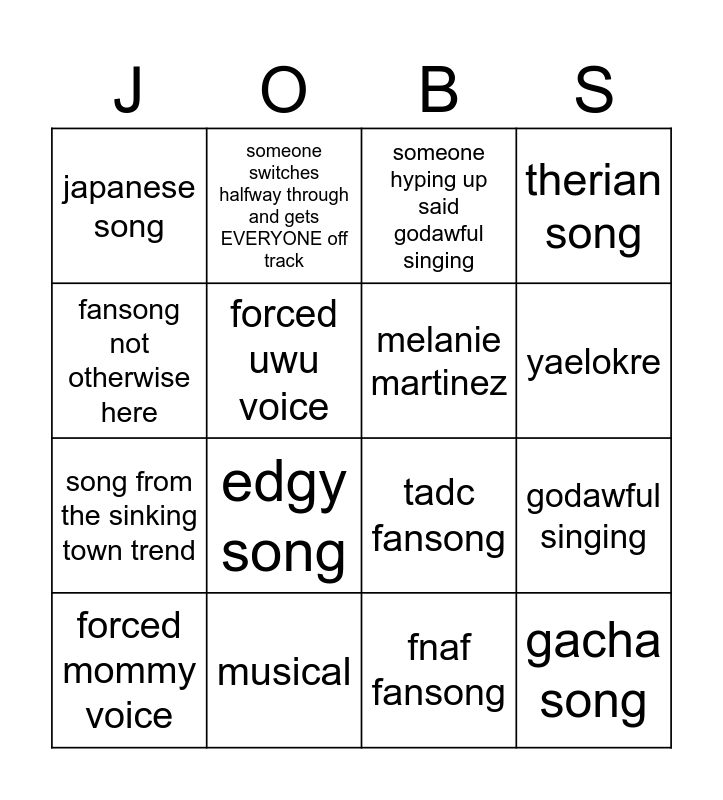 This bingo card has 16 words: musical, godawful singing, someone hyping up said godawful singing, japanese song, song from the sinking town trend, someone switches halfway through and gets EVERYONE off track, tadc fansong, fnaf fansong, fansong not otherwise here, forced uwu voice, forced mommy voice, therian song, edgy song, yaelokre, melanie martinez and gacha song.