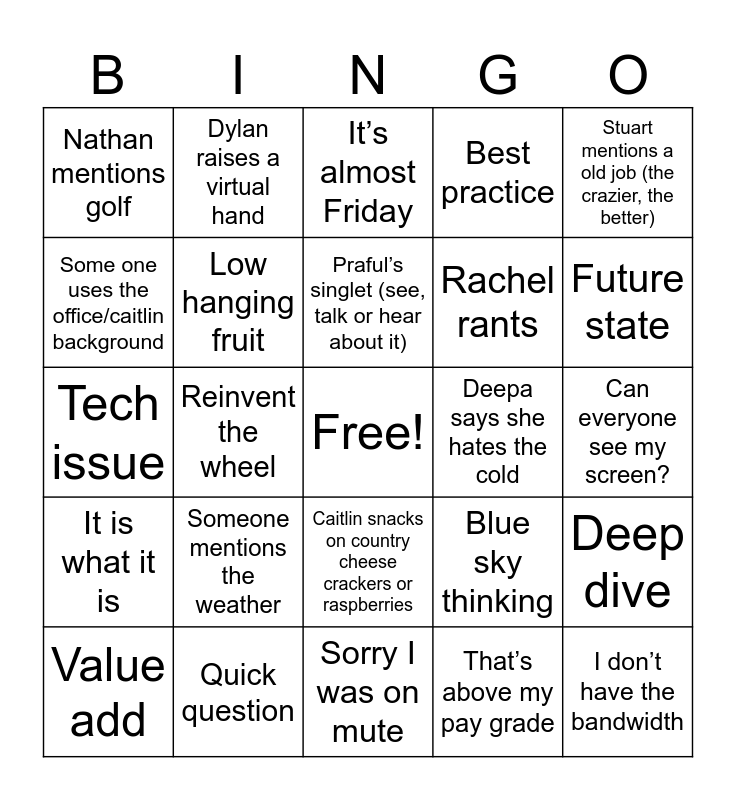 This bingo card has a free space and 25 words: Someone mentions the weather, Sorry I was on mute, Praful’s singlet (see, talk or hear about it), Value add, Stuart mentions a old job (the crazier, the better), Nathan mentions golf, Some one uses the office/caitlin background, Dylan raises a virtual hand, Deepa says she hates the cold, Caitlin snacks on country cheese crackers or raspberries, Rachel rants, Tech issue, Blue sky thinking, Deep dive, Low hanging fruit, Circle back, Can everyone see my screen?, It’s almost Friday, Future state, Reinvent the wheel, I don’t have the bandwidth, Quick question, It is what it is, Best practice and That’s above my pay grade.