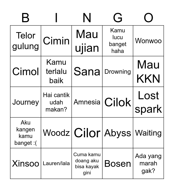This bingo card has a free space and 24 words: Woodz, Lauren/lala, Sana, Xinsoo, Wonwoo, Telor gulung, Cimol, Cimin, Cilok, Cilor, Drowning, Journey, Abyss, Waiting, Kamu terlalu baik, Bosen, Lost spark, Mau ujian, Mau KKN, Hai cantik udah makan?, Ada yang marah gak?, Aku kangen kamu banget :(, Kamu lucu banget haha and Cuma kamu doang aku bisa kayak gini.