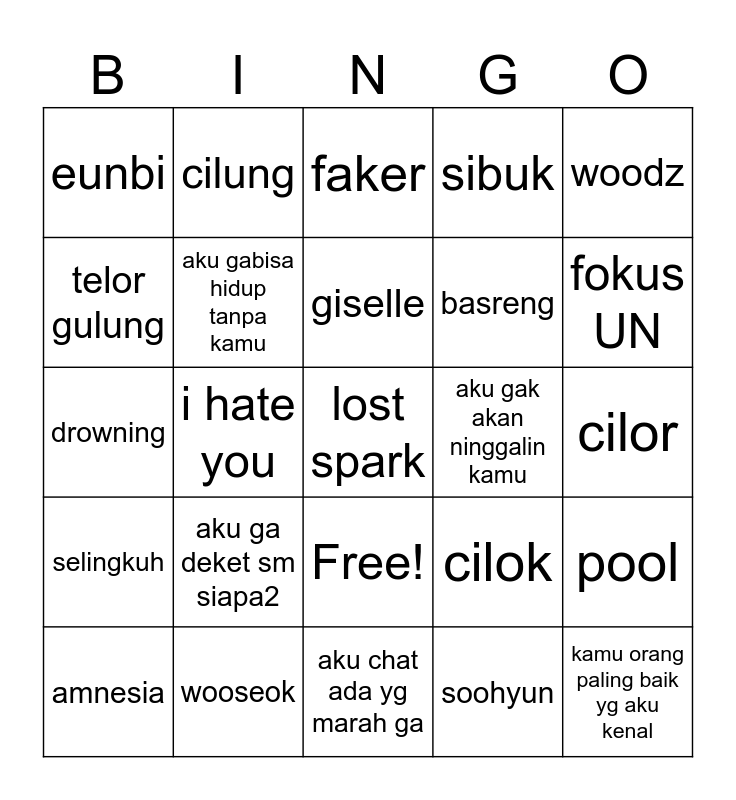 This bingo card has 26 words: Free!, soohyun, giselle, wooseok, woodz, eunbi, telor gulung, cilung, cilor, cilok, basreng, drowning, pool, amnesia, i hate you, sun or suck, sibuk, selingkuh, faker, lost spark, fokus UN, aku chat ada yg marah ga, aku gak akan ninggalin kamu, aku ga deket sm siapa2, aku gabisa hidup tanpa kamu and kamu orang paling baik yg aku kenal.
