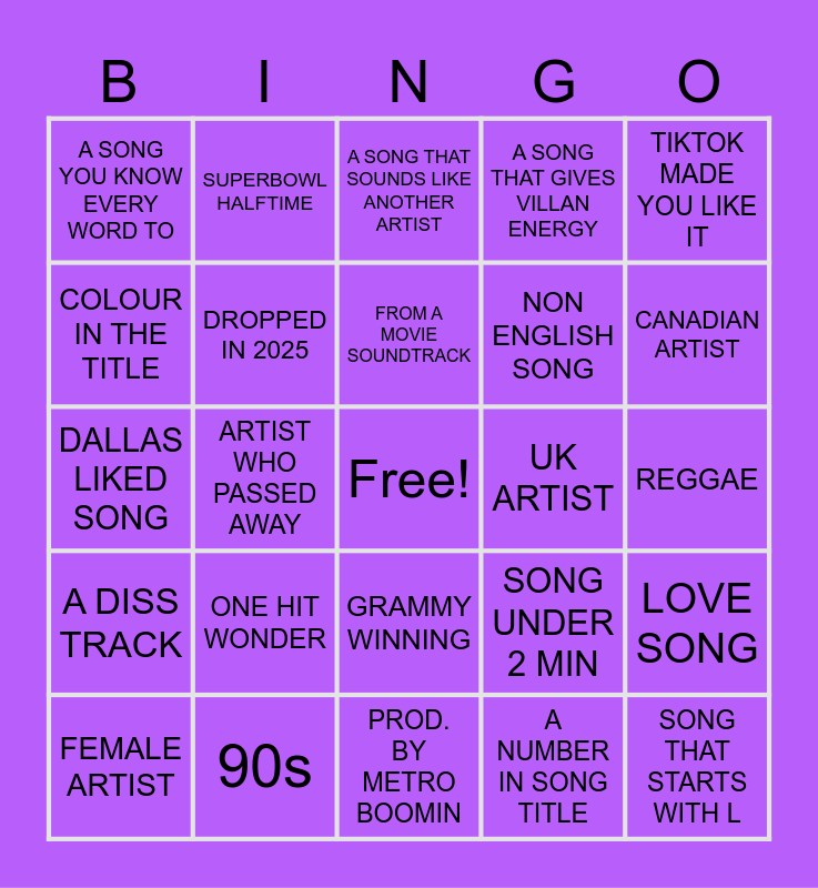 This bingo card has a free space and 24 words: ONE HIT WONDER, 90s, FROM A MOVIE SOUNDTRACK, FEMALE ARTIST, TIKTOK MADE YOU LIKE IT, A SONG YOU KNOW EVERY WORD TO, COLOUR IN THE TITLE, SUPERBOWL HALFTIME, UK ARTIST, GRAMMY WINNING, NON ENGLISH SONG, DALLAS LIKED SONG, SONG UNDER 2 MIN, LOVE SONG, DROPPED IN 2025, A NUMBER IN SONG TITLE, REGGAE, A SONG THAT SOUNDS LIKE ANOTHER ARTIST, CANADIAN ARTIST, ARTIST WHO PASSED AWAY, SONG THAT STARTS WITH L, A DISS TRACK, A SONG THAT GIVES VILLAN ENERGY and PROD. BY METRO BOOMIN.
