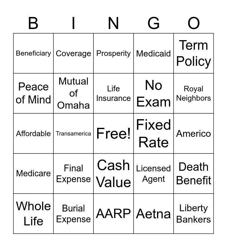 This bingo card has a free space and 24 words: Final Expense, Burial Expense, Life Insurance, Whole Life, Term Policy, Beneficiary, Peace of Mind, Coverage, Fixed Rate, Cash Value, No Exam, Affordable, Licensed Agent, Death Benefit, Mutual of Omaha, Aetna, Americo, Prosperity, Royal Neighbors, Transamerica, Liberty Bankers, Medicare, Medicaid and AARP.