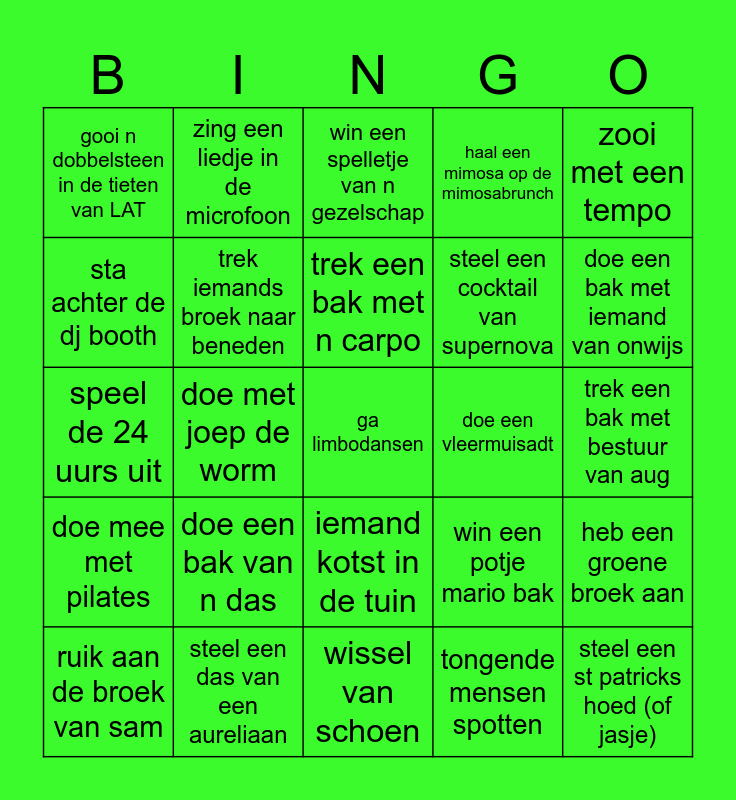 This bingo card has a free space and 26 words: iemand kotst in de tuin, tongende mensen spotten, trek een bak met n carpo, steel een das van een aureliaan, zooi met een tempo, gooi n dobbelsteen in de tieten van LAT, sta achter de dj booth, zing een liedje in de microfoon, trek een bak met bestuur van aug, win een potje mario bak, steel een cocktail van supernova, speel de 24 uurs uit, heb een groene broek aan, ruik aan de broek van sam, doe met joep de worm, ff de memo gemist, haal een mimosa op de mimosabrunch, doe mee met pilates, win een spelletje van n gezelschap, steel een st patricks hoed (of jasje), doe een bak met iemand van onwijs, wissel van schoen, doe een vleermuisadt, doe een bak van n das, trek iemands broek naar beneden and krijg een 24 uurs sticker.