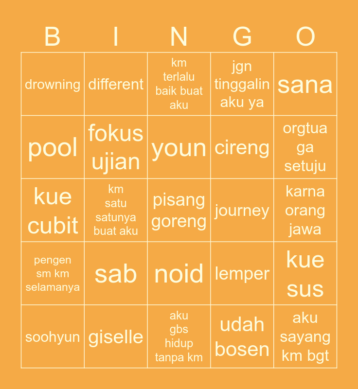 This bingo card has a free space and 24 words: sab, giselle, youn, soohyun, sana, drowning, pool, different, journey, noid, cireng, kue cubit, lemper, kue sus, fokus ujian, udah bosen, karna orang jawa, km terlalu baik buat aku, orgtua ga setuju, km satu satunya buat aku, aku sayang km bgt, pengen sm km selamanya, jgn tinggalin aku ya and aku gbs hidup tanpa km.