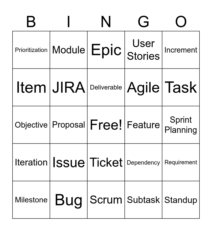 This bingo card has a free space and 24 words: Issue, Bug, Deliverable, Milestone, Increment, Prioritization, Item, Module, Feature, Ticket, Agile, Objective, Dependency, Requirement, JIRA, Subtask, Sprint Planning, Epic, Task, Proposal, Standup, Iteration, User Stories and Scrum.