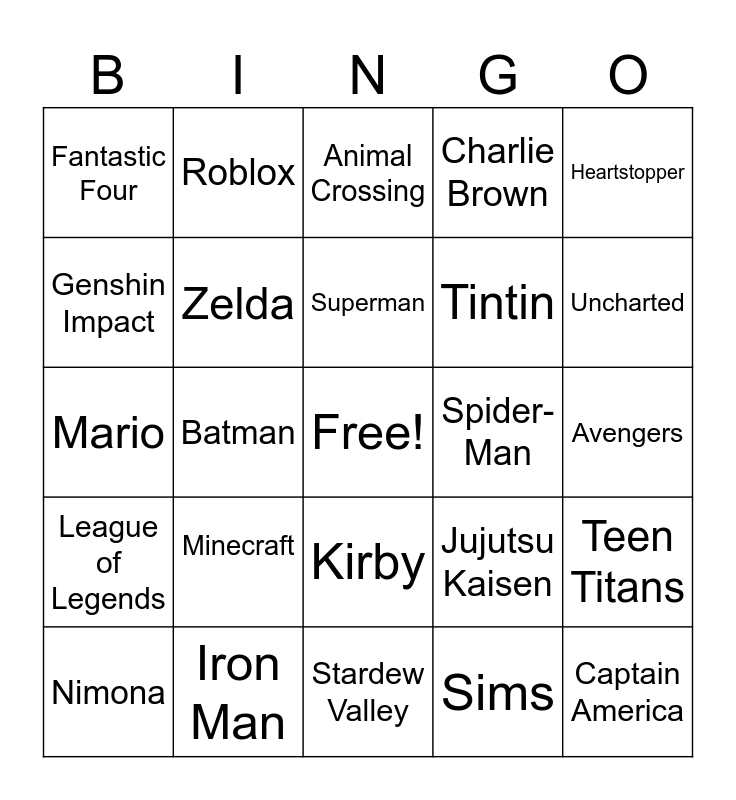 This bingo card has a free space and 24 words: Minecraft, Iron Man, Superman, Nimona, Heartstopper, Fantastic Four, Genshin Impact, Roblox, Spider-Man, Kirby, Tintin, Mario, Jujutsu Kaisen, Teen Titans, Zelda, Sims, Avengers, Animal Crossing, Uncharted, Batman, Captain America, League of Legends, Charlie Brown and Stardew Valley.
