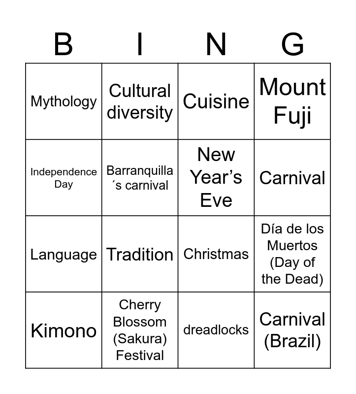 This bingo card has 41 words: Feria de las flores, Christmas, Halloween, New Year’s Eve, Oktoberfest, Mardi Gras, Carnival, Easter, Independence Day, Carnival (Brazil), Día de los Muertos (Day of the Dead), Mount Fuji, Kimono, dreadlocks, Cherry Blossom (Sakura) Festival, Bollywood, Zodiac, Mythology, Cultural diversity, Cuisine, folklore, preservation, Olympic games, Language, Cultural Identity, Symbol, Costume, cultural apropriation, Tradition, Parade, Cultural exchange, Cultural diversity, Chinese new year, Family dinners, Birthday tradition, Barranquilla´s carnival, Storytelling, Pot gathering (Colombia), Beliefs, History and Nationality.