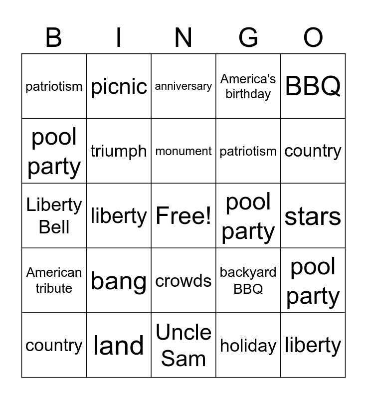 This bingo card has a free space and 132 words: Uncle Sam, United States4th of July, America, America's birthday, American flag, Independence, American tribute, anniversary, backyard BBQ, bang, banners, barbecue, BBQ, birthday, carnival, celebrations, Grill-out, history, holiday, Independence Day, kaboom, land, liberty, Liberty Bell, memorial, military, monument, national holiday, observance, parade, patriotism, picnic, pool party, country, crowds, explosions, family, family picnic, federal holiday4th of July, America, America's birthday, American flag, Independence, American tribute, anniversary, backyard BBQ, bang, banners, barbecue, BBQ, birthday, carnival, celebrations, Grill-out, history, holiday, Independence Day, kaboom, land, liberty, Liberty Bell, memorial, military, monument, national holiday, observance, parade, patriotism, picnic, pool party, country, crowds, explosions, family, family picnic, federal holiday, festival, firecracker, fireworks, fireworks display, Fourth of July, sparklers, spirit, stars, streamers, strength, stripes, summer, tradition, tribute, triumph, U.S. Flag, U.S.A., Uncle Sam, United States4th of July, America, America's birthday, American flag, Independence, American tribute, anniversary, backyard BBQ, bang, banners, barbecue, BBQ, birthday, carnival, celebrations, Grill-out, history, holiday, Independence Day, kaboom, land, liberty, Liberty Bell, memorial, military, monument, national holiday, observance, parade, patriotism, picnic, pool party, country, crowds, explosions, family, family picnic and federal holiday.