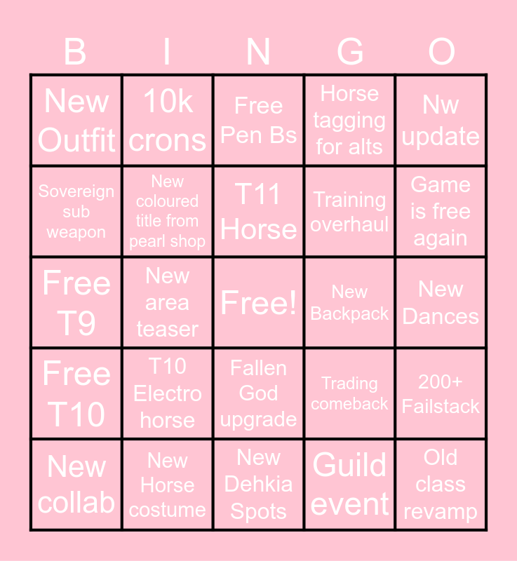 This bingo card has a free space and 24 words: T10 Electro horse, New Horse costume, T11 Horse, New collab, Nw update, New Outfit, Sovereign sub weapon, 10k crons, New Backpack, Fallen God upgrade, Training overhaul, Free T9, Trading comeback, 200+ Failstack, New coloured title from pearl shop, Guild event, New Dances, Free Pen Bs, Game is free again, New area teaser, Old class revamp, Free T10, Horse tagging for alts and New Dehkia Spots.