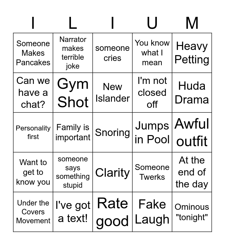 This bingo card has 25 words: someone says something stupid, Rate good, New Islander, Under the Covers Movement, Heavy Petting, Someone Makes Pancakes, Can we have a chat?, Narrator makes terrible joke, Jumps in Pool, Clarity, I'm not closed off, Personality first, Someone Twerks, At the end of the day, Gym Shot, Ominous "tonight", Awful outfit, someone cries, Huda Drama, Family is important, Snoring, I've got a text!, Want to get to know you, You know what I mean and Fake Laugh.