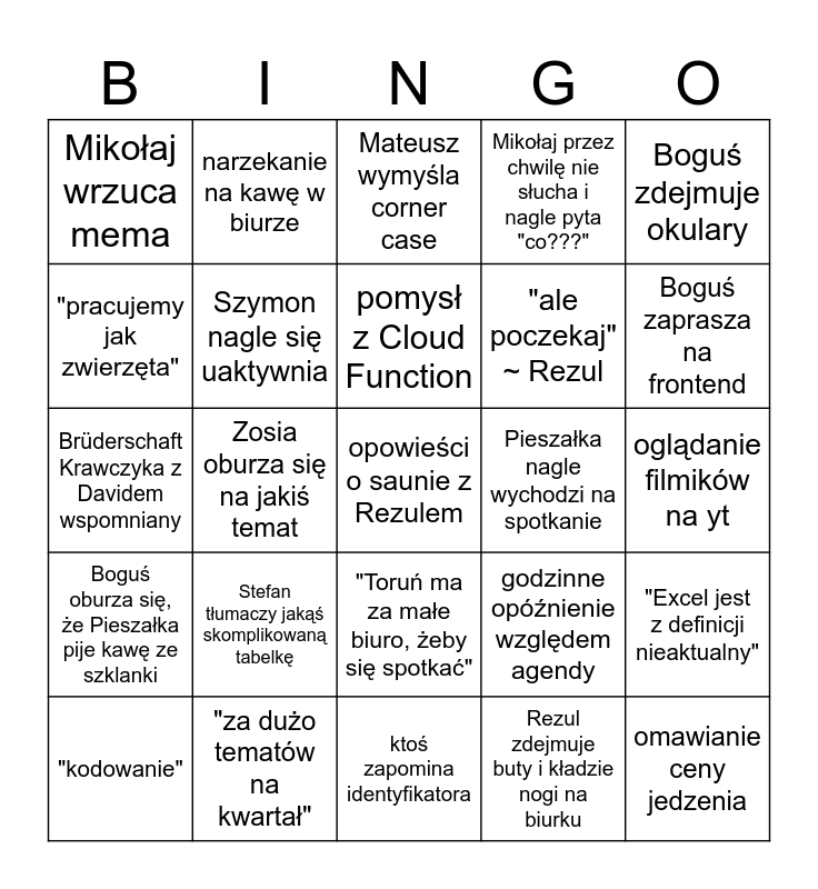 This bingo card has a free space and 24 words: Stefan tłumaczy jakąś skomplikowaną tabelkę, "za dużo tematów na kwartał", pomysł z Cloud Function, "kodowanie", Boguś zdejmuje okulary, Mikołaj wrzuca mema, "pracujemy jak zwierzęta", narzekanie na kawę w biurze, Pieszałka nagle wychodzi na spotkanie, "Toruń ma za małe biuro, żeby się spotkać", "ale poczekaj" ~ Rezul, Brüderschaft Krawczyka z Davidem wspomniany, godzinne opóźnienie względem agendy, "Excel jest z definicji nieaktualny", Szymon nagle się uaktywnia, Rezul zdejmuje buty i kładzie nogi na biurku, oglądanie filmików na yt, Mateusz wymyśla corner case, Boguś zaprasza na frontend, Zosia oburza się na jakiś temat, omawianie ceny jedzenia, Boguś oburza się, że Pieszałka pije kawę ze szklanki, Mikołaj przez chwilę nie słucha i nagle pyta "co???" and ktoś zapomina identyfikatora.