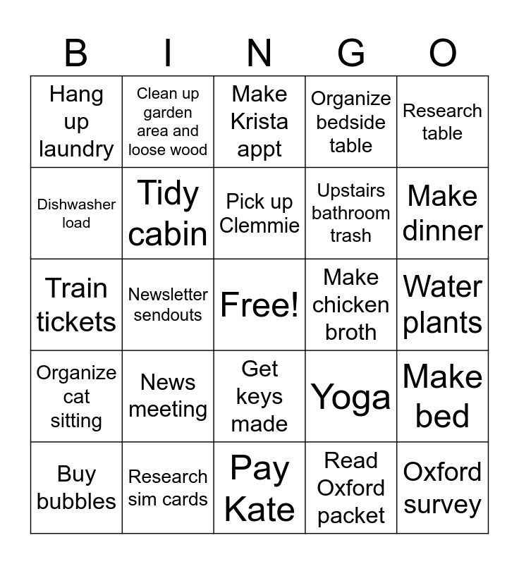 This bingo card has a free space and 24 words: News meeting, Research sim cards, Pick up Clemmie, Buy bubbles, Research table, Hang up laundry, Dishwasher load, Clean up garden area and loose wood, Make chicken broth, Get keys made, Upstairs bathroom trash, Train tickets, Yoga, Make bed, Tidy cabin, Read Oxford packet, Water plants, Make Krista appt, Make dinner, Newsletter sendouts, Oxford survey, Organize cat sitting, Organize bedside table and Pay Kate.