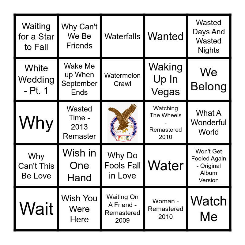 This bingo card has a free space and 57 words: Wagon Wheel, Wait, Waiting for a Girl like You, Waiting for a Star to Fall, Waiting On A Friend - Remastered 2009, Wake Me Up Before You Go-Go, Wake Me up When September Ends, Wake up Little Susie, Waking Up In Vegas, Walk, Wanted, Wanted Dead Or Alive, War, War Pigs, Warriors, Wasted, Wasted Days And Wasted Nights, Wasted Time - 2013 Remaster, Wasting My Time, Watch Me, Watching The Wheels - Remastered 2010, Watching You, Water, Waterfalls, Waterloo, Watermelon Crawl, Waymore's Blues, We Are The Champions, We Belong, We Belong Together, We Built This City, We Didn't Start the Fire, We Got The Beat, We Will Rock You, What A Wonderful World, White Wedding - Pt. 1, Who Let The Dogs Out, Why, WHY (feat. Luke Combs), Why Can't This Be Love, Why Can't We Be Friends, Why Do Fools Fall in Love, Why Don't You Get A Job, Why Not Me, Why'd You Come in Here Lookin' Like That, Wichita Lineman, Wish in One Hand, Wish You Were Here, Witchy Woman - 2013 Remaster, With Arms Wide Open, Without You, Woman - Remastered 2010, Women, Wonderful Tonight, Wonderwall, Won't Get Fooled Again - Original Album Version and Worst Way.