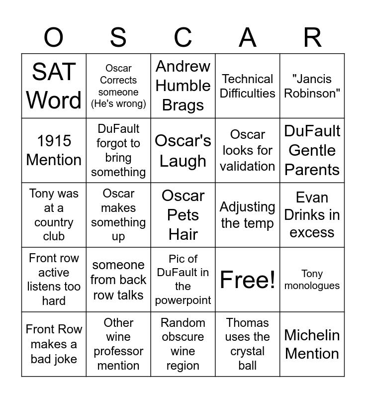 This bingo card has 25 words: someone from back row talks, Random obscure wine region, Oscar's Laugh, Front Row makes a bad joke, "Jancis Robinson", SAT Word, 1915 Mention, Oscar Corrects someone (He's wrong), Adjusting the temp, Pic of DuFault in the powerpoint, Oscar looks for validation, Tony was at a country club, Free!, Tony monologues, DuFault forgot to bring something, Michelin Mention, Evan Drinks in excess, Andrew Humble Brags, DuFault Gentle Parents, Oscar makes something up, Oscar Pets Hair, Other wine professor mention, Front row active listens too hard, Technical Difficulties and Thomas uses the crystal ball.