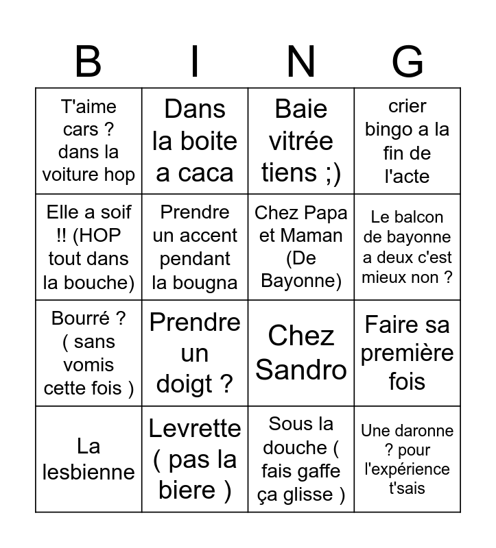 This bingo card has 16 words: Levrette ( pas la biere ), Faire sa première fois, Baie vitrée tiens ;), T'aime cars ? dans la voiture hop, Bourré ? ( sans vomis cette fois ), Dans la boite a caca, Chez Sandro, Sous la douche ( fais gaffe ça glisse ), Elle a soif !! (HOP tout dans la bouche), Prendre un accent pendant la bougna, La lesbienne, crier bingo a la fin de l'acte, Prendre un doigt ?, Le balcon de bayonne a deux c'est mieux non ?, Chez Papa et Maman (De Bayonne) and Une daronne ? pour l'expérience t'sais.