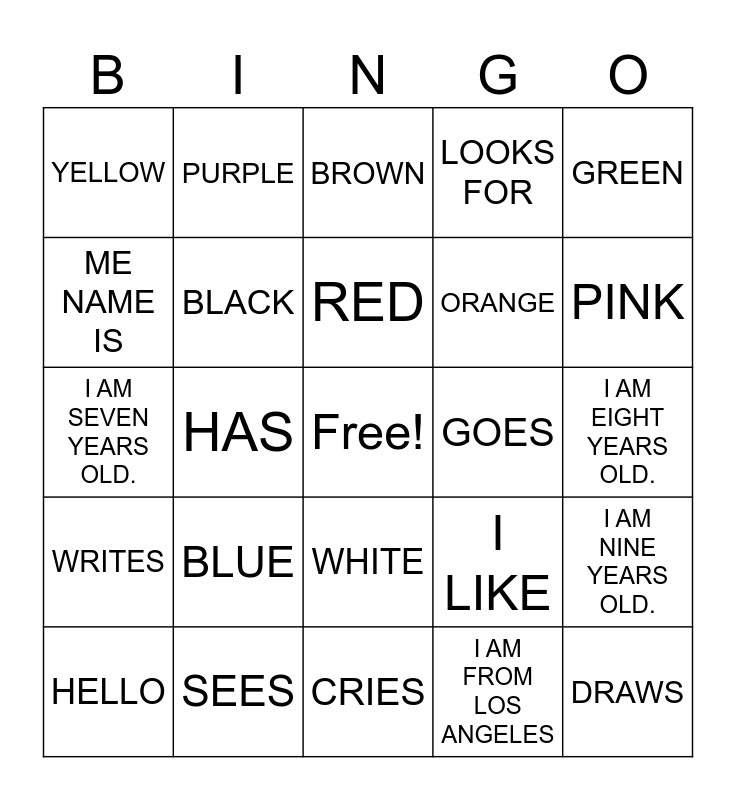 This bingo card has a free space and 24 words: BLUE, SEES, RED, HELLO, GREEN, YELLOW, ME NAME IS, PURPLE, GOES, WHITE, ORANGE, I AM SEVEN YEARS OLD., I LIKE, I AM NINE YEARS OLD., BLACK, I AM FROM LOS ANGELES, I AM EIGHT YEARS OLD., BROWN, PINK, HAS, DRAWS, WRITES, LOOKS FOR and CRIES.