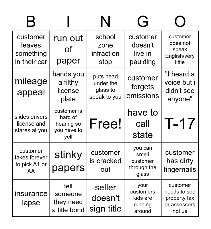 This bingo card has a free space and 24 words: stinky papers, tell someone they need a title bond, puts head under the glass to speak to you, insurance lapse, customer does not speak English/very little, customer leaves something in their car, mileage appeal, run out of paper, have to call state, customer is cracked out, customer forgets emissions, slides drivers license and stares at you, you can smell customer through the glass, customer has dirty fingernails, hands you a filthy license plate, your customers kids are running around, T-17, school zone infraction stop, "I heard a voice but i didn't see anyone", customer is hard of hearing so you have to yell, customer needs to see property tax or assessors not us, customer takes forever to pick A1 or AA, customer doesn't live in paulding and seller doesn't sign title.