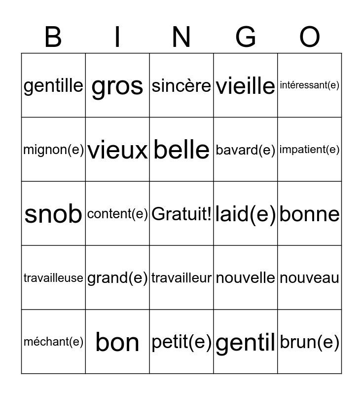 This bingo card has a free space and 47 words: blond(e), brun(e), roux, petit(e), grand(e), mince, gros, grosse, mignon(e), jeune, vieux, vieille, nouveau, nouvelle, joli(e), beau, belle, laid(e), intelligent(e), intéressant(e), content(e), gentil, gentille, bavard(e), patient(e), impatient(e), méchant(e), amusant(e), travailleur, travailleuse, paresseux, paresseuse, drôle, bête, mauvais(e), bon, bonne, timide, stupide, pénible, sympathique, sincère, snob, sportif, sportive, triste and fâché(e).