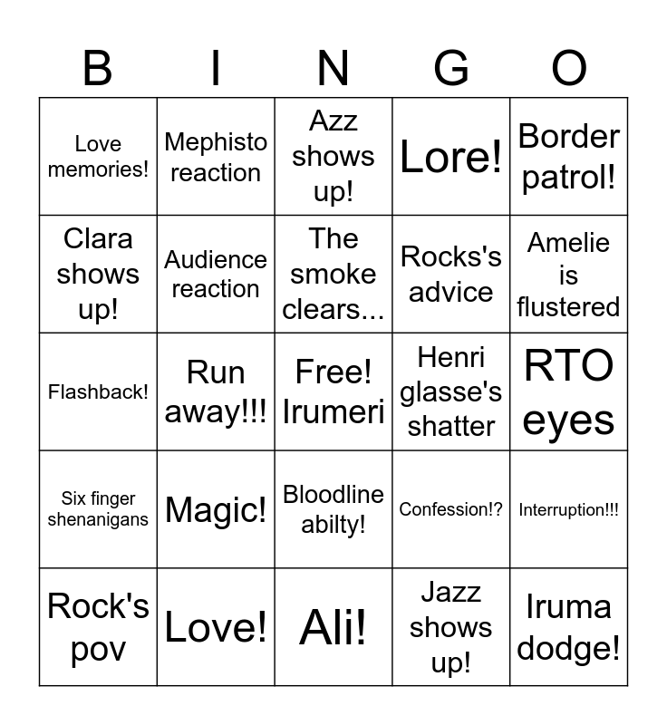 This bingo card has a free space and 28 words: Interruption!!!, Kiss?!?, Rocks's advice, Jazz shows up!, Clara shows up!, Azz shows up!, Mephisto reaction, Six finger shenanigans, Henri glasse's shatter, Rock's pov, Flashback!, Lore!, Love!, Ali!, Amelie is flustered, Iruma evades Amelie, Magic!, Audience reaction, The smoke clears..., Bloodline abilty!, Love memories!, Wings!, Iruma dodge!, Run away!!!, RTO eyes, Confession!?, Border patrol! and New emote faces!.