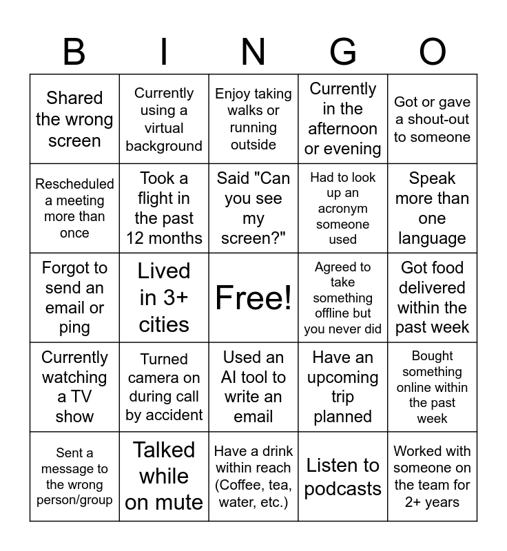This bingo card has a free space and 24 words: Turned camera on during call by accident, Talked while on mute, Said "Can you see my screen?", Sent a message to the wrong person/group, Got or gave a shout-out to someone, Shared the wrong screen, Rescheduled a meeting more than once, Currently using a virtual background, Agreed to take something offline but you never did, Used an AI tool to write an email, Had to look up an acronym someone used, Forgot to send an email or ping, Have an upcoming trip planned, Bought something online within the past week, Took a flight in the past 12 months, Listen to podcasts, Got food delivered within the past week, Enjoy taking walks or running outside, Speak more than one language, Lived in 3+ cities, Worked with someone on the team for 2+ years, Currently watching a TV show, Currently in the afternoon or evening and Have a drink within reach (Coffee, tea, water, etc.).