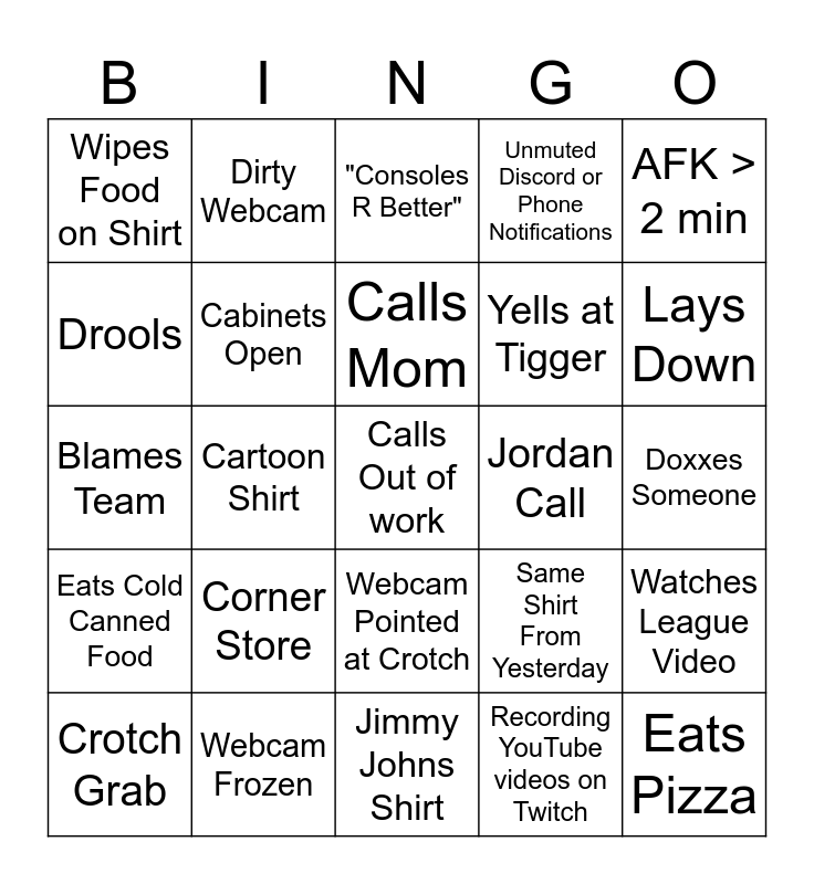 This bingo card has 25 words: Corner Store, Jimmy Johns Shirt, Calls Mom, Crotch Grab, AFK > 2 min, Wipes Food on Shirt, Drools, Dirty Webcam, Jordan Call, Webcam Pointed at Crotch, Yells at Tigger, Blames Team, Same Shirt From Yesterday, Watches League Video, Cabinets Open, Eats Pizza, Doxxes Someone, "Consoles R Better", Lays Down, Cartoon Shirt, Calls Out of work, Webcam Frozen, Eats Cold Canned Food, Unmuted Discord or Phone Notifications and Recording YouTube videos on Twitch.