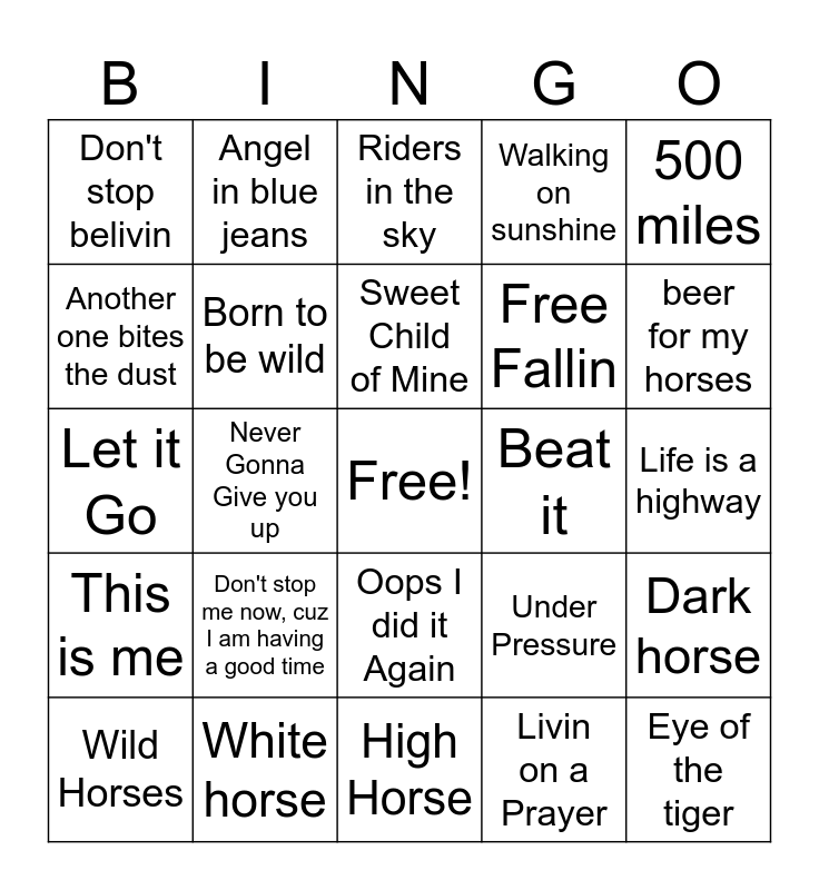 This bingo card has a free space and 35 words: Wild Things, Here I am, Get off of my back, Born to be wild, Oops I did it Again, Walking on sunshine, Another one bites the dust, Cotton Eye Joe, Sweet Child of Mine, Welcome to the jungle, Let it Go, 500 miles, Take on me, Africa, Don't stop belivin, Beat it, Livin on a Prayer, Never Gonna Give you up, This is me, Eye of the tiger, Under Pressure, Wild Horses, Dark horse, White horse, Riders in the sky, beer for my horses, All the kings horses, Chasin Wild horses, Free Fallin, Life is a highway, Ride, High Horse, Don't stop me now, cuz I am having a good time, Angel in blue jeans and Cupid Shuffle.