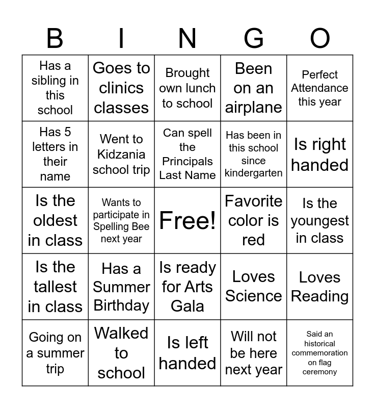 This bingo card has a free space and 24 words: Going on a summer trip, Has a Summer Birthday, Can spell the Principals Last Name, Will not be here next year, Perfect Attendance this year, Has a sibling in this school, Goes to clinics classes, Brought own lunch to school, Favorite color is red, Is the youngest in class, Is the oldest in class, Went to Kidzania school trip, Loves Science, Loves Reading, Has 5 letters in their name, Walked to school, Is left handed, Been on an airplane, Is right handed, Is the tallest in class, Wants to participate in Spelling Bee next year, Is ready for Arts Gala, Has been in this school since kindergarten and Said an historical commemoration on flag ceremony.