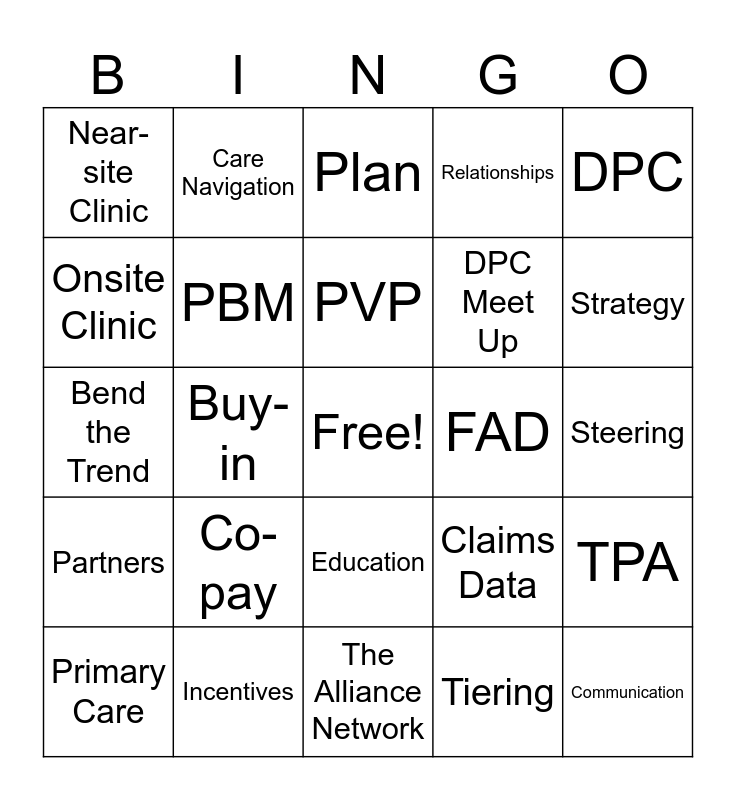 This bingo card has a free space and 24 words: Co-pay, Incentives, PVP, Primary Care, DPC, Near-site Clinic, Onsite Clinic, Care Navigation, FAD, Education, DPC Meet Up, Bend the Trend, Claims Data, TPA, PBM, Tiering, Steering, Plan, Strategy, Buy-in, Communication, Partners, Relationships and The Alliance Network.