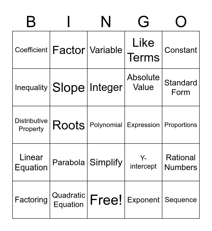 This bingo card has 25 words: Linear Equation, Quadratic Equation, Polynomial, Exponent, Constant, Coefficient, Factor, Variable, Expression, Rational Numbers, Inequality, Slope, Free!, Y-intercept, Standard Form, Factoring, Roots, Integer, Absolute Value, Proportions, Distributive Property, Parabola, Simplify, Like Terms and Sequence.