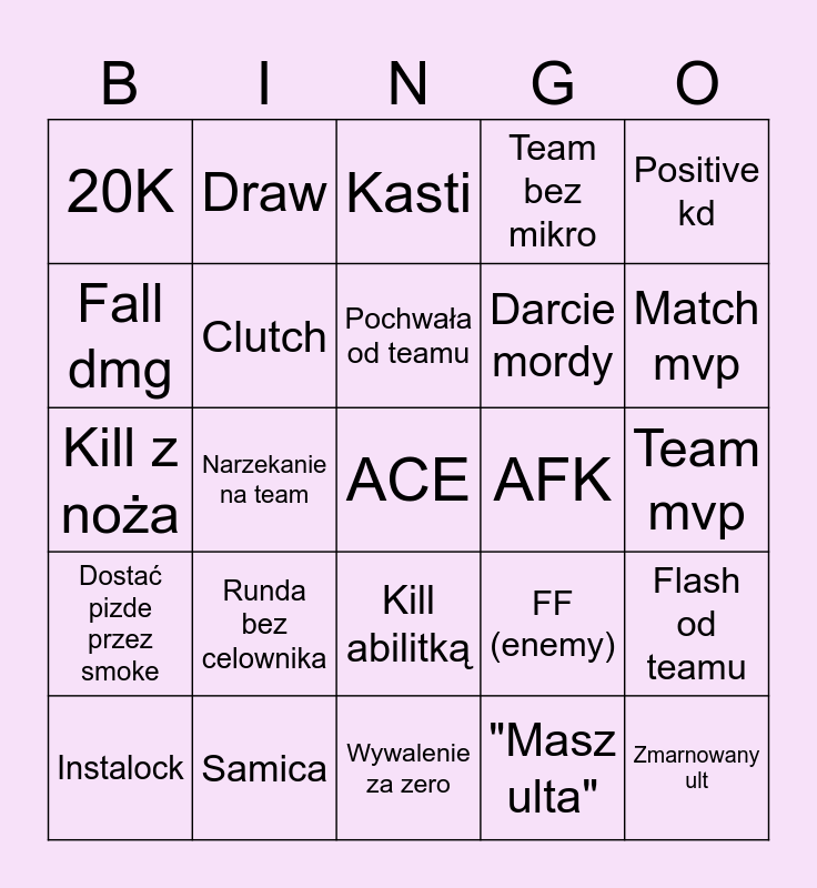 This bingo card has a free space and 24 words: Runda bez celownika, Samica, Pochwała od teamu, Instalock, Positive kd, 20K, Fall dmg, Draw, AFK, Kill abilitką, Darcie mordy, Kill z noża, FF (enemy), Flash od teamu, Clutch, "Masz ulta", Team mvp, Kasti, Match mvp, Narzekanie na team, Zmarnowany ult, Dostać pizde przez smoke, Team bez mikro and Wywalenie za zero.