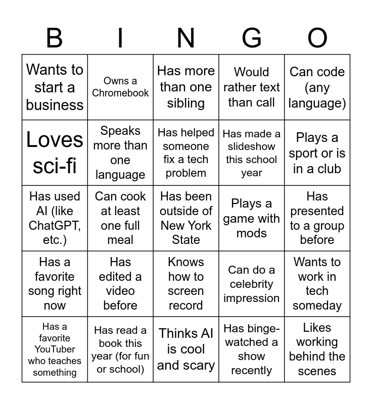 This bingo card has 25 words: Has edited a video before, Thinks AI is cool and scary, Has helped someone fix a tech problem, Has a favorite YouTuber who teaches something, Can code (any language), Wants to start a business, Loves sci-fi, Owns a Chromebook, Plays a game with mods, Knows how to screen record, Has made a slideshow this school year, Has used AI (like ChatGPT, etc.), Can do a celebrity impression, Wants to work in tech someday, Speaks more than one language, Likes working behind the scenes, Has presented to a group before, Has more than one sibling, Plays a sport or is in a club, Can cook at least one full meal, Has been outside of New York State, Has read a book this year (for fun or school), Has a favorite song right now, Would rather text than call and Has binge-watched a show recently.