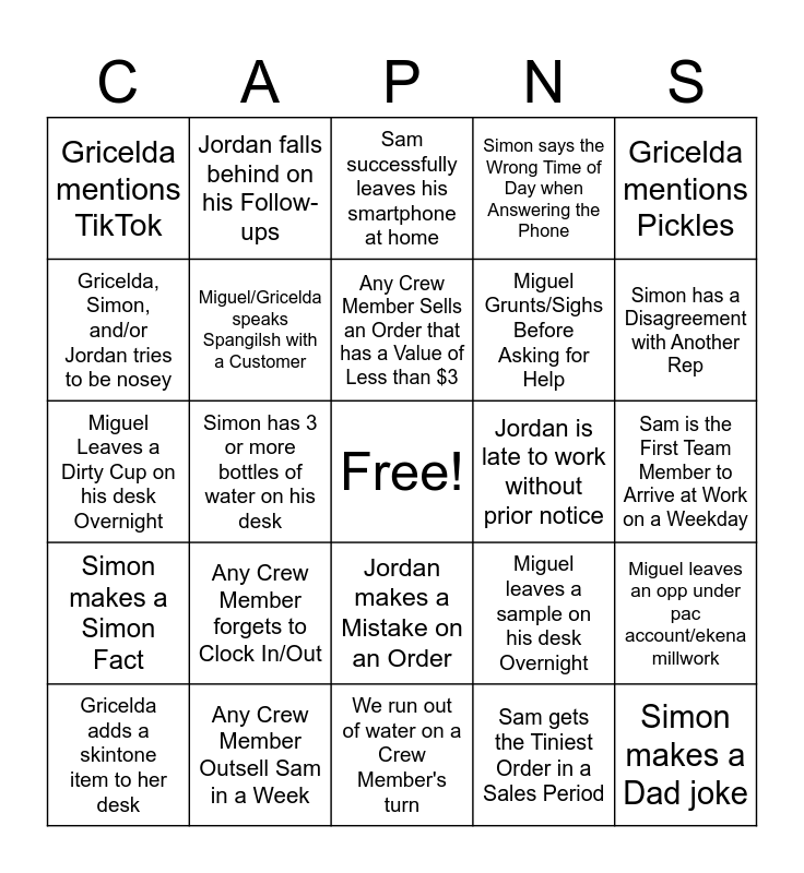 This bingo card has a free space and 24 words: Any Crew Member forgets to Clock In/Out, Any Crew Member Outsell Sam in a Week, Any Crew Member Sells an Order that has a Value of Less than $3, Gricelda adds a skintone item to her desk, Gricelda mentions Pickles, Gricelda mentions TikTok, Gricelda, Simon, and/or Jordan tries to be nosey, Jordan falls behind on his Follow-ups, Jordan is late to work without prior notice, Jordan makes a Mistake on an Order, Miguel Grunts/Sighs Before Asking for Help, Miguel Leaves a Dirty Cup on his desk Overnight, Miguel leaves a sample on his desk Overnight, Miguel leaves an opp under pac account/ekena millwork, Miguel/Gricelda speaks Spangilsh with a Customer, Sam gets the Tiniest Order in a Sales Period, Sam is the First Team Member to Arrive at Work on a Weekday, Sam successfully leaves his smartphone at home, Simon has a Disagreement with Another Rep, Simon has 3 or more bottles of water on his desk, Simon makes a Dad joke, Simon makes a Simon Fact, Simon says the Wrong Time of Day when Answering the Phone and We run out of water on a Crew Member's turn.