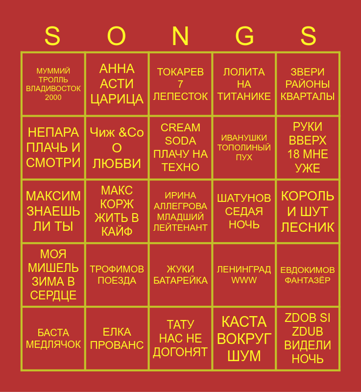 This bingo card has 32 words: КАСТА ВОКРУГ ШУМ, КИПЕЛОВ Я СВОБОДЕН, МАКС КОРЖ ЖИТЬ В КАЙФ, АННА АСТИ ПО БАРАМ, МОЯ МИШЕЛЬ ЗИМА В СЕРДЦЕ, Чиж &Со О ЛЮБВИ, ЗВЕРИ РАЙОНЫ КВАРТАЛЫ, ЕВДОКИМОВ ФАНТАЗЁР, АННА АСТИ ЦАРИЦА, ZDOB SI ZDUB ВИДЕЛИ НОЧЬ, CREAM SODA ПЛАЧУ НА ТЕХНО, ТОКАРЕВ 7 ЛЕПЕСТОК, СТРЫКАЛО НАШЕ ЛЕТО, АНДРЕЙ ГУБИН НОЧЬ, ШАТУНОВ СЕДАЯ НОЧЬ, БУМБОКС ВАХТЕРАМ, БАСТА МЕДЛЯЧОК, МАКСИМ ЗНАЕШЬ ЛИ ТЫ, ЖУКИ БАТАРЕЙКА, ТРОФИМОВ ПОЕЗДА, ЛЕНИНГРАД WWW, ЛЕНИНГРАД В ПИТЕРЕ ПИТЬ, КОРОЛЬ И ШУТ ЛЕСНИК, ЕЛКА ПРОВАНС, ИРИНА АЛЛЕГРОВА МЛАДШИЙ ЛЕЙТЕНАНТ, ЛОЛИТА НА ТИТАНИКЕ, ИВАНУШКИ ТОПОЛИНЫЙ ПУХ, НЕПАРА ПЛАЧЬ И СМОТРИ, МУММИЙ ТРОЛЛЬ ВЛАДИВОСТОК 2000, ТАТУ НАС НЕ ДОГОНЯТ, СЕКТОР ГАЗА 30 ЛЕТ and РУКИ ВВЕРХ 18 МНЕ УЖЕ.