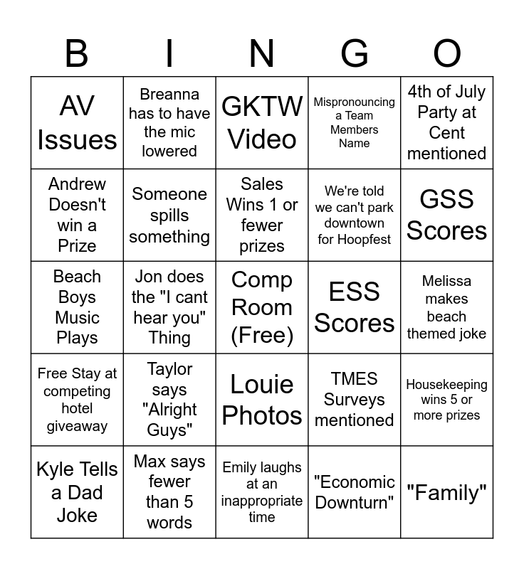 This bingo card has a free space and 29 words: Kyle Tells a Dad Joke, Tower and Davenport Renovation update, Jon does the "I cant hear you" Thing, Jon does a sports metaphor, AV Issues, GKTW Video, Someone spills something, Taylor says "Alright Guys", ESS Scores, Max says fewer than 5 words, Melissa makes beach themed joke, "Family", Emily laughs at an inappropriate time, "Economic Downturn", GSS Scores, Brandon Shushes ones of us, Louie Photos, Free Stay at competing hotel giveaway, 4th of July Party at Cent mentioned, Beach Boys Music Plays, TMES Surveys mentioned, Joe piggybacks a joke off the person before him, We're told we can't park downtown for Hoopfest, Andrew Doesn't win a Prize, Mispronouncing a Team Members Name, Breanna has to have the mic lowered, Housekeeping wins 5 or more prizes, Sales Wins 1 or fewer prizes and Alicia makes something competitive that isn't.