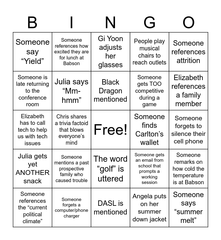This bingo card has a free space and 32 words: Angela puts on her summer down jacket, Carlton mentions a terrible movie that he loves, Chris shares a trivia factoid that blows everyone’s mind, Someone says “full pay boarder”, Julia gets yet ANOTHER snack, Julia says “Mm-hmm”, Someone references attrition, Someone remarks on how cold the temperature is at Babson, Someone references how excited they are for lunch at Babson, Someone says “international student definition”, Black Dragon mentioned, Gi Yoon adjusts her glasses, Liz says “I have a question…”, Reference to an aged-related injury of any staff member, Someone finds Carlton’s wallet, Liz wins again for best song selection in the mystery song game, Someone references the “current political climate”, Elizabeth has to call tech to help us with tech issues, The word “golf” is uttered, Someone mentions a past prospective family who caused trouble, Someone gets an email from school that prompts a working session, Someone says “Making the Most of May”, Someone forgets to silence their cell phone, Someone forgets a computer/phone charger, Someone says “summer melt”, People play musical chairs to reach outlets, Someone gets TOO competitive during a game, Someone is late returning to the conference room, Someone say “Yield”, DASL is mentioned, Chris twitches at the mention of name tags and Elizabeth references a family member.