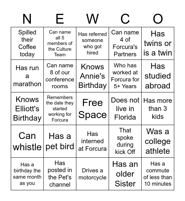 This bingo card has a free space and 24 words: Has a pet bird, Has posted in the Pet's channel, Knows Annie's Birthday, Has a birthday the same month as you, Has twins or is a twin, Spilled their Coffee today, Has run a marathon, Can name all 5 members of the Culture Team, Does not live in Florida, Has interned at Forcura, Who has worked at Forcura for 5+ Years, Knows Elliott's Birthday, That spoke during kick Off, Was a college athlete, Can name 8 of our conference rooms, Has an older Sister, Has more than 3 kids, Has referred someone who got hired, Has studied abroad, Remembers the date they started working for Forcura, Has a commute of less than 10 minutes, Can whistle, Can name 4 of Forcura's Partners and Drives a motorcycle.