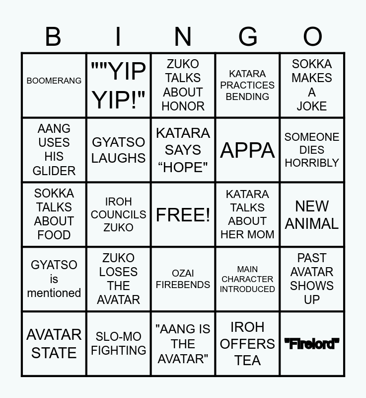 This bingo card has a free space and 24 words: AVATAR STATE, ZUKO LOSES THE AVATAR, KATARA SAYS “HOPE", IROH OFFERS TEA, SOKKA MAKES A JOKE, BOOMERANG, ""YIP YIP!", ZUKO TALKS ABOUT HONOR, KATARA TALKS ABOUT HER MOM, NEW ANIMAL, SOKKA TALKS ABOUT FOOD, GYATSO LAUGHS, MAIN CHARACTER INTRODUCED, PAST AVATAR SHOWS UP, AANG USES HIS GLIDER, SLO-MO FIGHTING, "AANG IS THE AVATAR", KATARA PRACTICES BENDING, SOMEONE DIES HORRIBLY, GYATSO is mentioned, IROH COUNCILS ZUKO, OZAI FIREBENDS, APPA and "Firelord".