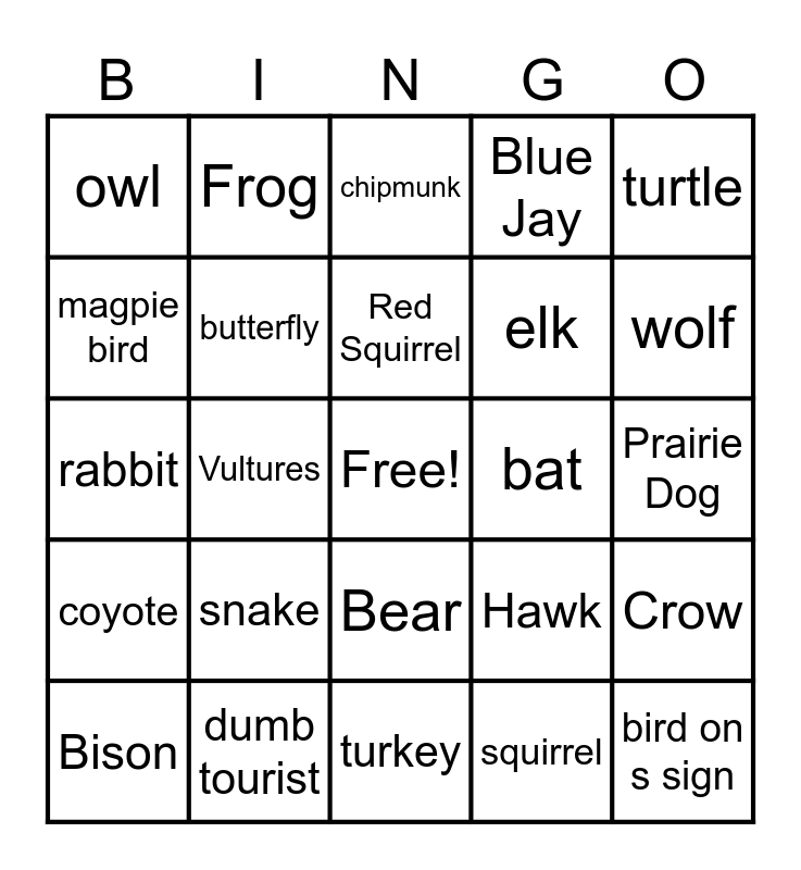 This bingo card has a free space and 29 words: Bison, deer, Vultures, Wild Donkey, owl, chipmunk, butterfly, snake, bat, dumb tourist, Prairie Dog, bird on s sign, turkey, squirrel, wolf, Bald Eagle, Bear, coyote, turtle, rabbit, Hawk, Moose, elk, magpie bird, Blue Jay, Frog, Crow, Red Squirrel and Mountain Goat.