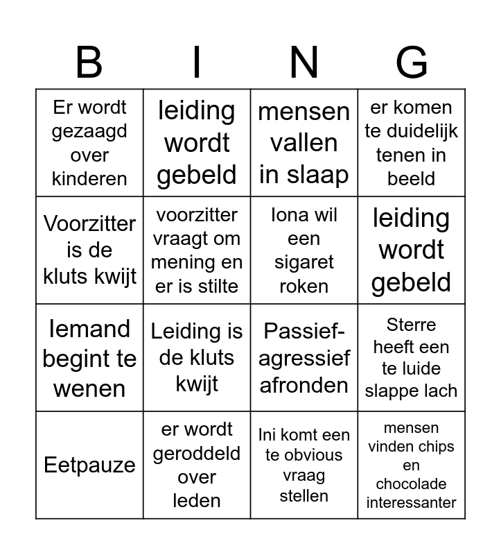 This bingo card has 19 words: Passief-agressief afronden, pieper met heimwee, mensen vallen in slaap, mensen vinden chips en chocolade interessanter, Sterre heeft een te luide slappe lach, Voorzitter is de kluts kwijt, Ini komt een te obvious vraag stellen, Er wordt gezaagd over kinderen, leiding wordt gebeld, Iemand begint te wenen, Leiding is de kluts kwijt, voorzitter vraagt om mening en er is stilte, Iona wil een sigaret roken, er wordt geroddeld over leden, Eetpauze, het onderwerp verandert heel plots naar iets totaal anders, er komen te duidelijk tenen in beeld, leiding wordt gebeld and onnuttige discussie die totaal niet over het onderwerp gaat.