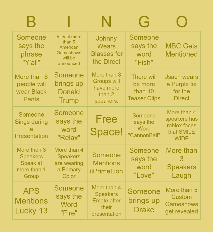 This bingo card has a free space and 24 words: More than 4 Speakers are wearing a Primary Color, Someone says the Word "Fire", More than 3 Groups will have more than 2 speakers., APS Mentions Lucky 13, MBC Gets Mentioned, Someone says the phrase "Y'all", More than 6 people will wear Black Pants, Atleast more than 5 American Gameshows will be announced, Someone says the Word "CannonBall", Someone Mentions iiPrimeLion, There will be more than 10 Teaser Clips, Someone Sings during a Presentation, Someone says the word "Love", More than 3 Speakers Laugh, Someone brings up Donald Trump, Someone brings up Drake, More than 4 speakers has roblox faces that SMILE WIDE, Johnny Wears Glasses for the Direct, Jsach wears a Purple tie for the Direct, Someone says the word "Relax", More than 5 Custom Gameshows get revealed, More then 3 Speakers Speak at more than 1 Group, Someone says the word "Fish" and More than 4 Speakers Emote after their presentation.