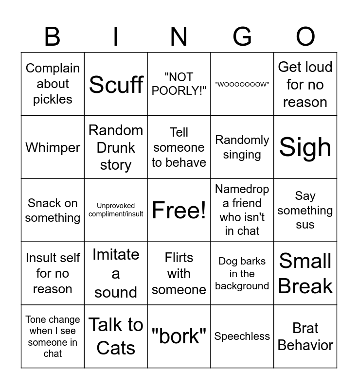 This bingo card has a free space and 24 words: Imitate a sound, Talk to Cats, Tell someone to behave, Tone change when I see someone in chat, Get loud for no reason, Complain about pickles, Whimper, Scuff, Namedrop a friend who isn't in chat, Flirts with someone, Randomly singing, Snack on something, Dog barks in the background, Small Break, Random Drunk story, Speechless, Say something sus, "NOT POORLY!", Sigh, Unprovoked compliment/insult, Brat Behavior, Insult self for no reason, "WOOOOOOOW" and "bork".